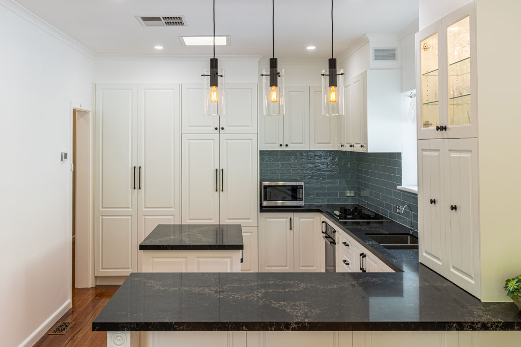 This Hampton-style kitchen exudes elegance and functionality, featuring Shaker-style doors and panels in a 2-pack white satin finish. The space is enhanced by a durable Caesar stone benchtop paired with a classic subway-tiled splashback, adding timeless appeal. A semi-butler pantry offers convenient bench space for small appliances, keeping the main kitchen area clutter-free. An above-bench cabinet includes a display section for crystalware, adding a touch of sophistication. The kitchen is equipped with integrated appliances, including a fridge, rangehood, and dishwasher, ensuring a seamless look. Completing the design, a bulkhead with a cornice finish adds a refined architectural touch to the space.
